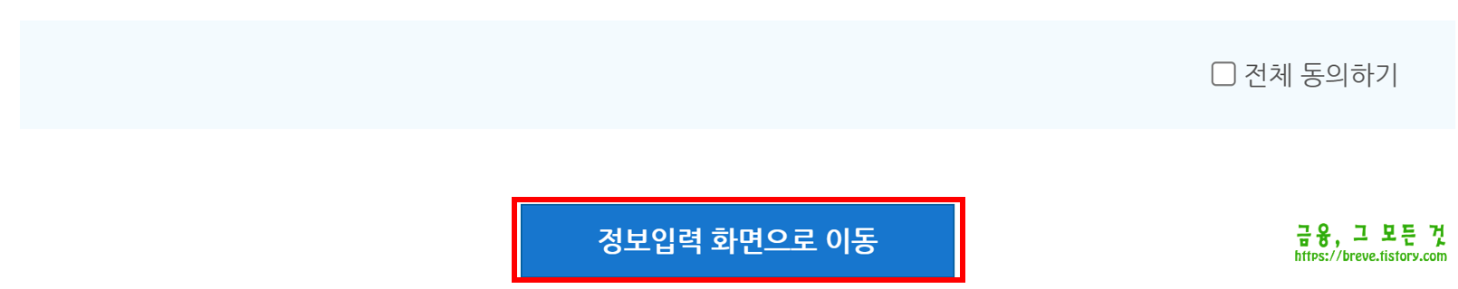 서비스 이용 및 개인(신용)정보 수집 및 이용, 개인(신용)정보 제3자 제공 동의, 계좌통합관리서비스 이용약관 항목을 확인하고 동의에 모두 체크 후 하단의 "정보입력 화면으로 이동"을 클릭합니다.