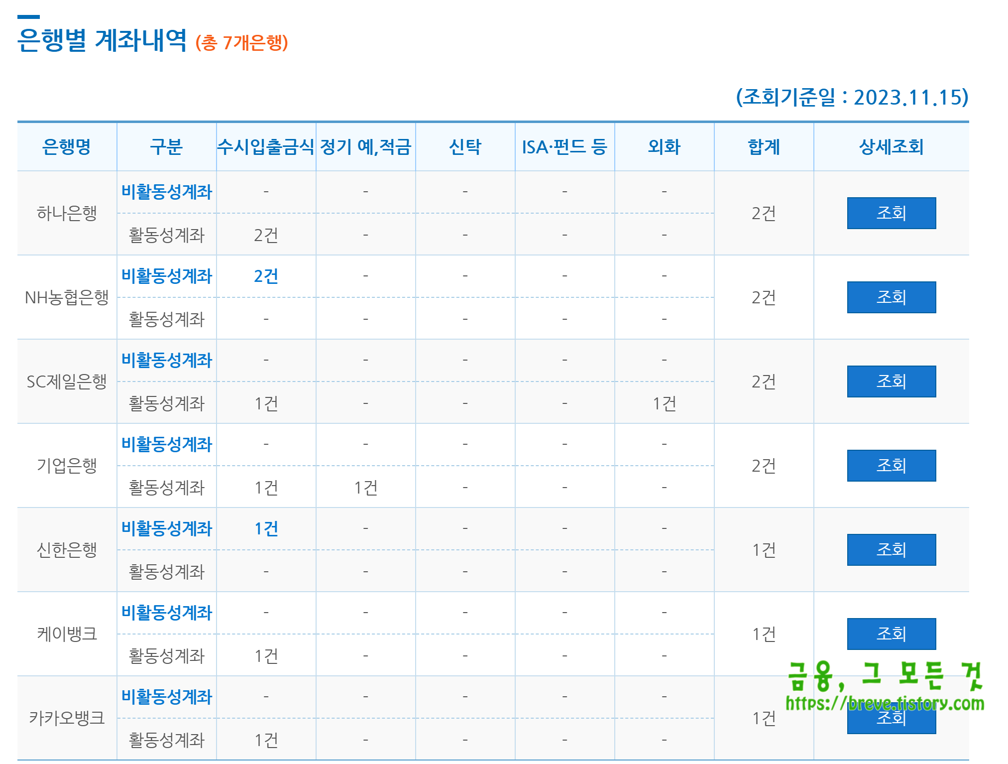 은행별 계좌 내역을 확인합니다. 상세조회를 원하시면 오른쪽 "조회"버튼을 클릭합니다.