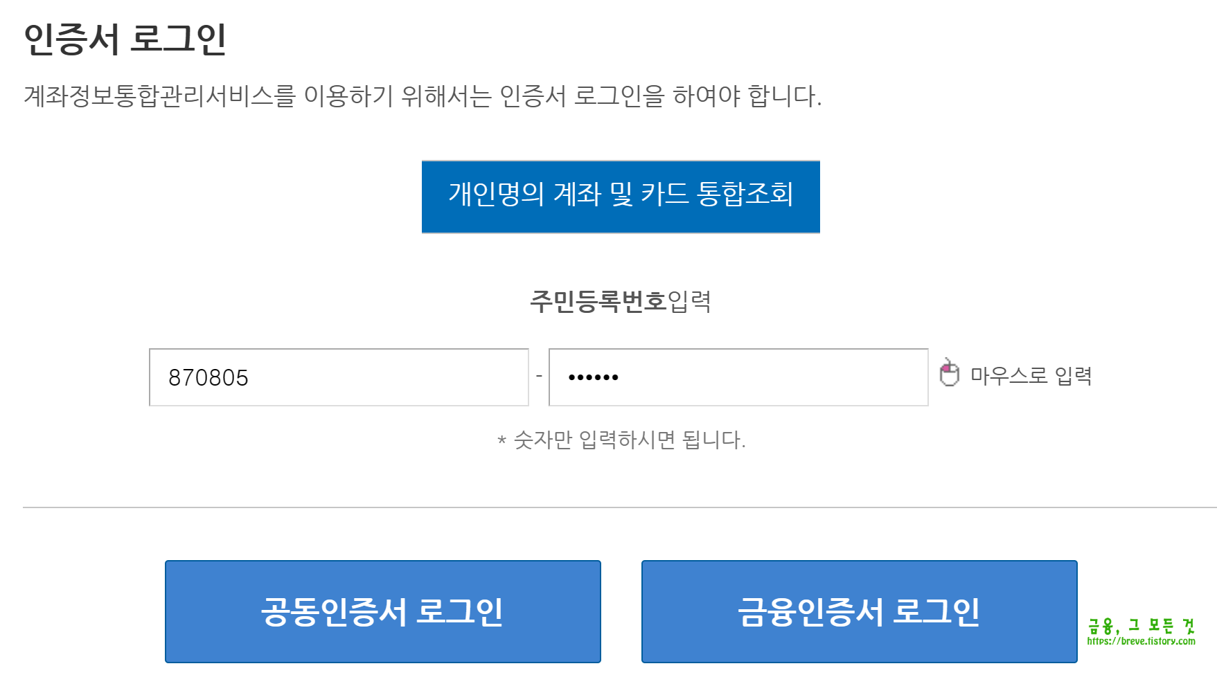 계좌정보통합관리서비스를 이용하기 위해서는 인증서 로그인을 진행해야 합니다. 공동인증서 및 금융인증서로 로그인이 가능합니다. 주민등록번호를 입력 후 "공동인증서 로그인"을 클릭합니다. 주민등록번호 뒷자리는 "마우스로 입력" 버튼을 클릭하여 작성하셔야 합니다.