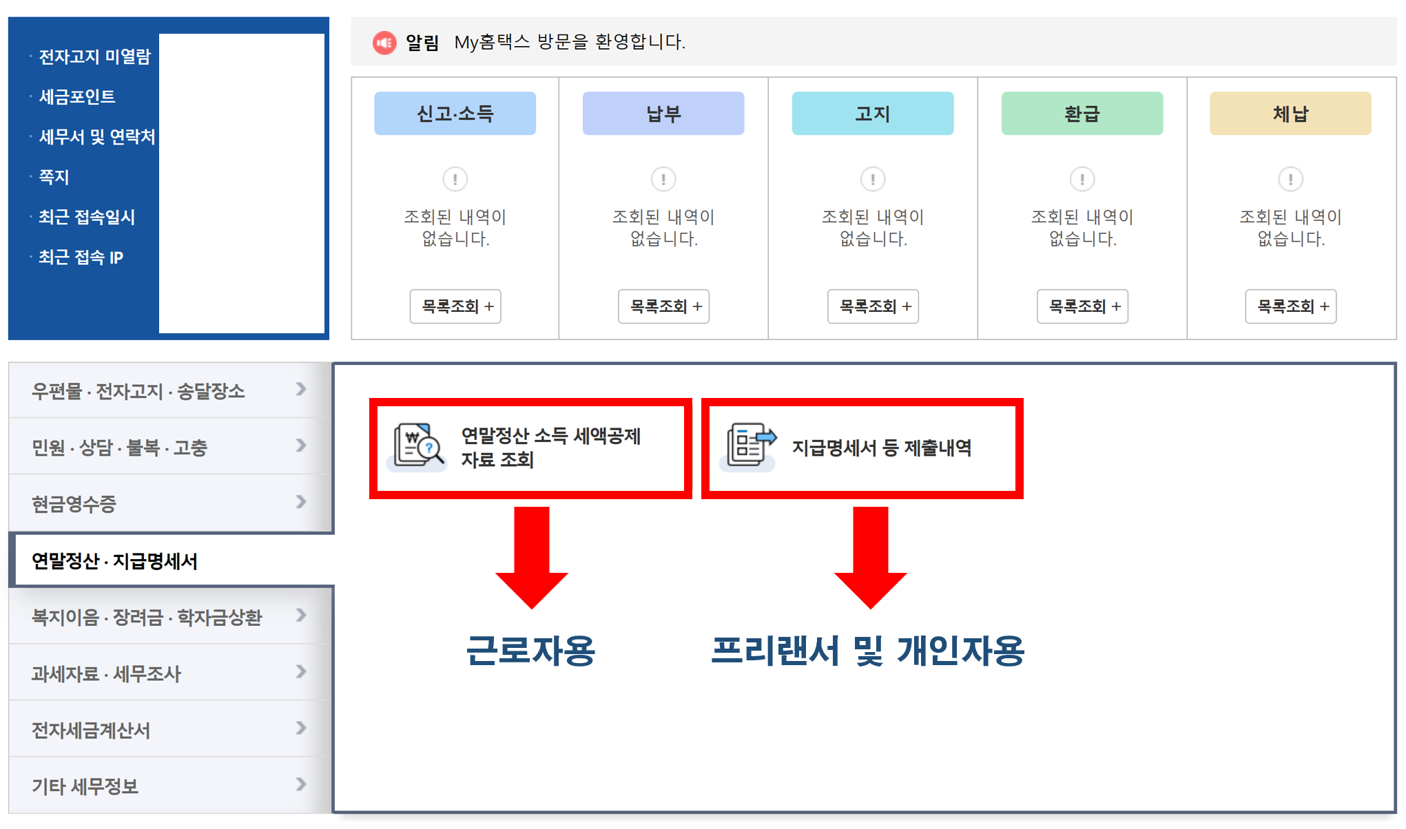 - 우측 연말정산 소득 세액공제 자료 조회(근로소득자), 지급명세서 등 제출내역(프리랜서, 개인 사업자) 중 선택하여 클릭합니다.