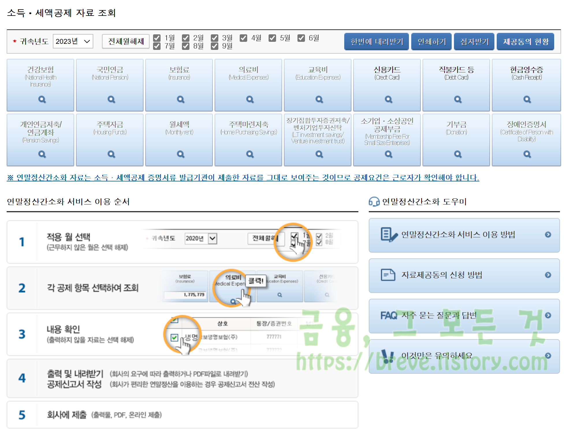 기업에 재직자인 경우 위 화면에서 근로자용인 "연말정산 소득 세액공제 자료 조회"를 클릭합니다. 다음 소득·세액공제 자료 조회 화면에서 다음과 같은 이용 순서를 참고하여 진행합니다.