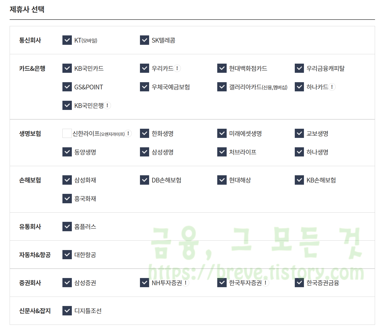 주소 변경을 원하는 항목을 선택합니다. 전체 선택하여 진행한다면 회원가입이 되어 있지 않은 제휴사는 결과 알림에 변경 실패라고 출력됩니다. 본인이 가입된 제휴사를 모르겠다 싶으시면 전체 클릭하시는게 좋습니다. 제휴사에 포함되지 않은 곳은 아쉽지만 Kt moving 통해 일괄적으로 변경할 수가 없습니다.