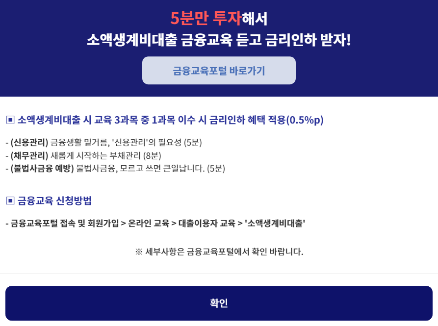 ● 서금원 금융교육포털(https://edu.kinfa.or.kr) 접속 - 회원가입 - “온라인교육” - “대출이용자 교육” - “소액생계비대출” 접속 후 교육 이수